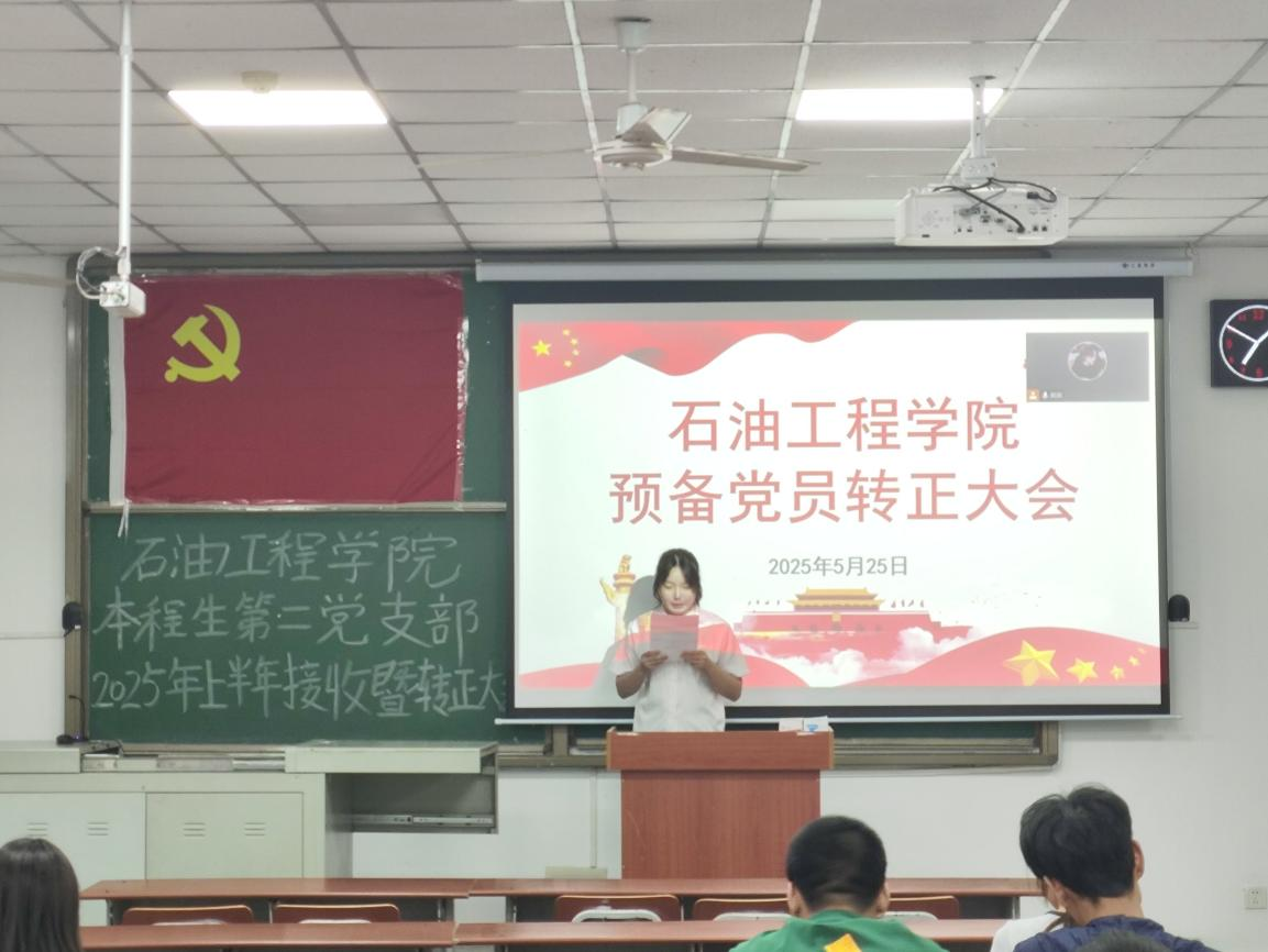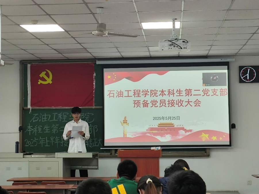 本科生第二党支部于武教B-206召开2025年上半年预备党员接受暨预备党员转正大会。本次会议由郭灏贤同志主持,支部书记韩清越和全体党员参加。